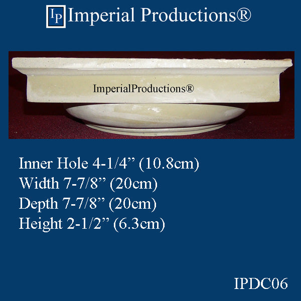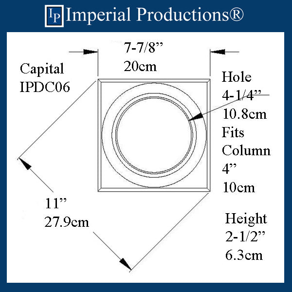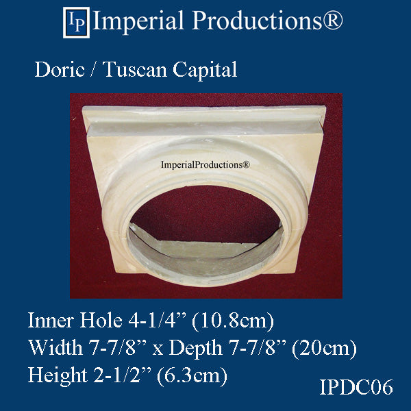 IPDC06-CAP is a Doric Capital molded as 1 piece (Stepped Abacus & Round Echinus). The hole fits around a 4" round top of column (approximate 4-1/2" hole size). The column's load from the lintel resides on the substrate. The capital does not hold load. It is available in ArchPolymerTM a lite weight composite material rot water and insect resistant for interior and exterior. Optional materials include ArchPolymerTM Class A Fire Rated, GRG-NeoPlasterTM for interior fire rated applications, GFRC-ZeamentTM a Portland cement composite Class A fire rated for high traffic commercial interior and exterior applications. Customize with optional factory cuts. Specify Split for Pilaster up against a wall, Split for Post wrap, Wedged for outside corners, Section cut for Wall Wraps - specify the size, Quartered for inside corners, or Engaged for portion cuts for Pilaster applications. This capital can be ordered FactoryPainted or components can be RealMetalCoated