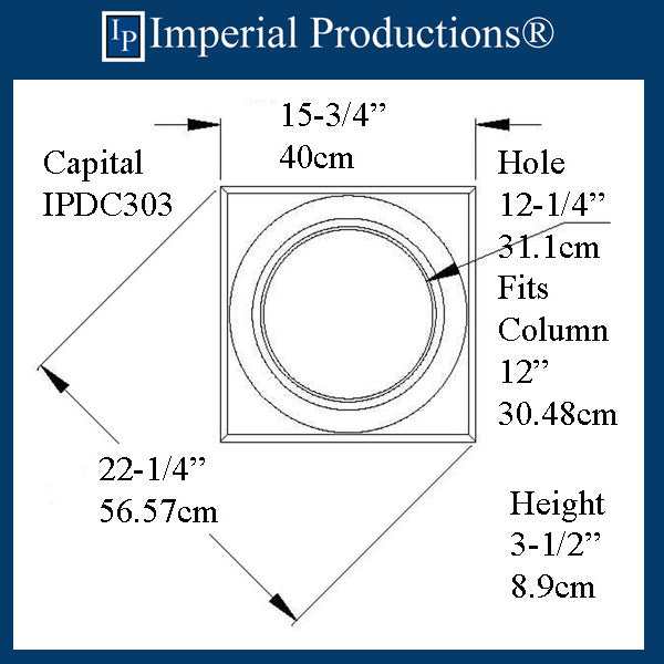 IPDC303-CAP is a Doric Capital molded as 1 piece (Stepped Abacus & Round Echinus). The hole fits around a 12" round top of column (approximate 12-1/4" hole size). The column's load from the lintel resides on the substrate. The capital does not hold load. It is available in ArchPolymerTM a lite weight composite material rot water and insect resistant for interior and exterior. Optional materials include ArchPolymerTM Class A Fire Rated, GRG-NeoPlasterTM for interior fire rated applications, GFRC-ZeamentTM a Portland cement composite Class A fire rated for high traffic commercial interior and exterior applications. Customize with optional factory cuts. Specify Split for Pilaster up against a wall, Split for Post wrap, Wedged for outside corners, Section cut for Wall Wraps - specify the size, Quartered for inside corners, or Engaged for portion cuts for Pilaster applications. This capital can be ordered FactoryPainted or components can be RealMetalCoated