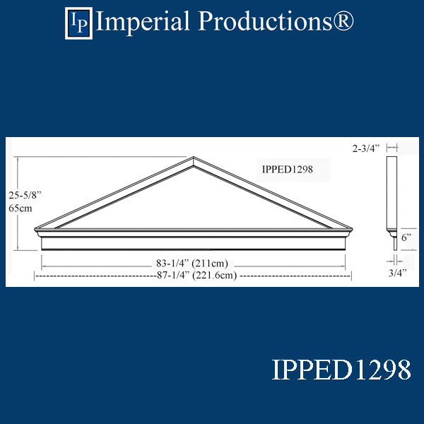 IPPED1298 is a Federal style Peaked Pediment with a Frieze Board. It is perfect for interior and exterior applications above doors or windows. The frieze board is 83-1/4" (211cm) wide. The widest point is 87-1/4" (221.6cm). The depth of the top of the pediment is 2-3/4". It is available in ArchPolymerTM (a synthetic plaster) for interior and exterior use. For Interior Commercial and Public Buildings specify Fire Rated ArchPolymerTM or GRG-NeoPlasterTM (real plaster).