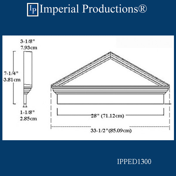 IPPED1300 is a Federal style Triangle Pediment with a Frieze Board. The top of the pediment is sloped for water runoff. It is perfect for interior and exterior applications. The frieze board is 32-1/2" (85cm) wide. The depth of the top of the pediment is 3-1/8" (7.93cm). It is available in ArchPolymerTM (a synthetic plaster) for interior and exterior use. For Interior Commercial and Public Buildings specify Fire Rated ArchPolymerTM or GRG-NeoPlasterTM (real plaster).