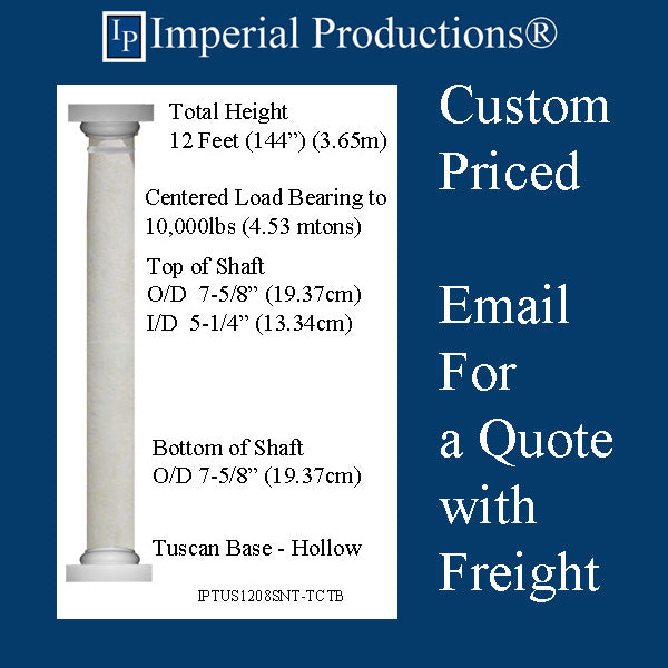 IPTUS1208SNT is a 12 Feet High 7-3/4" Diameter FRP-PolyCompTM Tuscan Column Non-Tapered meaning the top of the shaft is the same diameter as the bottom of the shaft. The shaft weighs 89 lbs. The capital and base are hollow with the load bearing shaft sitting on the level substrate. All loads must be centered on the shaft. The astragal is a separate component placed by others. Customize by optional factory cuts. Specify Split for Pilaster up against a wall, Split for Post wrap, Wedged for an outside corners, Section cut for Wall Wraps - specify the size, Quartered for inside corners, or Engaged for portion cuts for Pilaster applications. It can wrap a (5" Round Post) or a (4"x4" Square Post). This column can be ordered FactoryPainted or components can be RealMetalCoated, or FireRated. Print the Brochure to request a custom quote with freight.